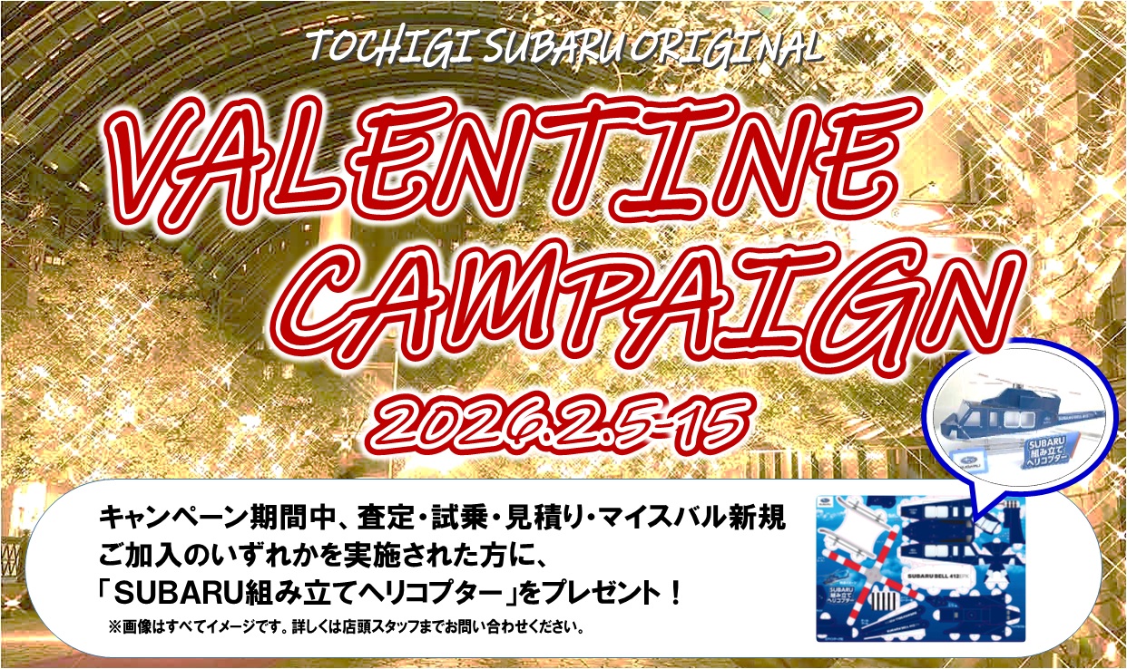 栃木スバルでは、SUBARUプレミアフェアと同時開催で「TOCHIGI SUBARU バレンタインキャンペーン」を実施いたします。