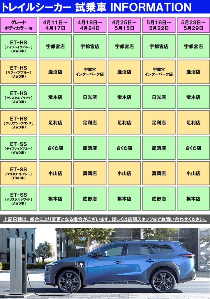 栃木スバルで、新型トレイルシーカーを「体感試乗」 2026 4/09 PickUp イベント お知らせ 2026年4月9日 新型トレイルシーカーを体感するチャンス!!下記の日程で栃木スバルの店舗を巡回します。お近くの店舗に来た際にはぜひご体感ください。 PickUp イベント お知らせ URLをコピーしました! トレイルシーカーデビュー記念「1台プレゼントキャンペーン」実施中 「BEV LIFEスタートアップキャンペーン」実施中!